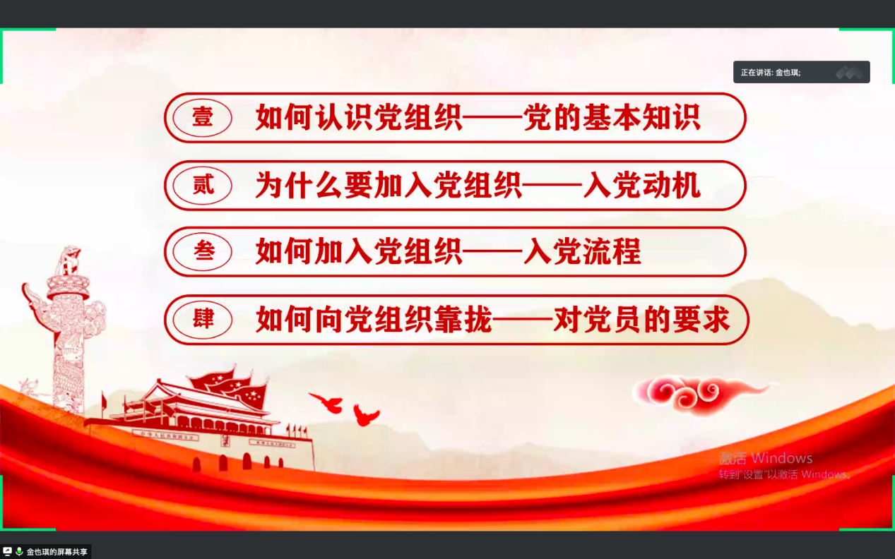随后,金也琪正式开展党课教育。她从党的基本知识、入党动机、入党流程及对党员的要求四个方面进行讲解。金也琪通过党的性质、党的最高理想、党的根本宗旨及党的指导思想四个方面介绍了党的基本知识。她同时强调,党的先进性,为我国抗击新冠肺炎疫情斗争提供了极大的制度优势。接着,她以“为什么要加入党组织”这个问题,引出了学生对入党动机的思考。金也琪表明,端正入党动机,不是入党前一时的问题,而是一辈子的问题。在介绍完入党条件后,金也琪详细介绍了党员发展流程和入党申请书的内容和格式。在她看来,发展党员是一个漫长的过程,党组织对党员的筛选及其严格,新生应在明晰入党动机的基础上,尽早开展入党流程。紧接着,金也琪向新生展示了金沙集团3354cc本科生党支部的工作与活动日常。她特别介绍了外院本科生党支部在疫情期间创立的“公译”翻译平台和“新火”宣讲团两个组织。最后,金也琪对有意愿加入党组织的新生提出几点要求。一,不断端正自己的入党动机——从党史入手;二,按照党员标准严格要求自己,在思想上自觉加强党性锻炼,在学习中不断提升自己的理论水平、文化素质和工作能力,及在生活中牢记党的组织,做全心全意为人民服务的模范。党课最后,张明明对党课内容进行总结,并鼓励新生积极进取,以高标准要求自身,争取加入党组织,更好地贡献自己的力量。