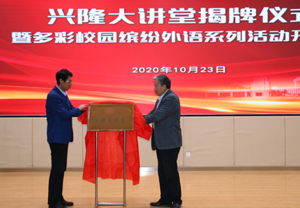 2020年10月23日晚,兴隆大讲堂揭牌仪式暨“多彩校园、缤纷外语”系列活动开幕式在兴隆山校区讲学堂101报告厅举行。校党委副书记仝兴华为兴隆大讲堂揭牌并讲话。