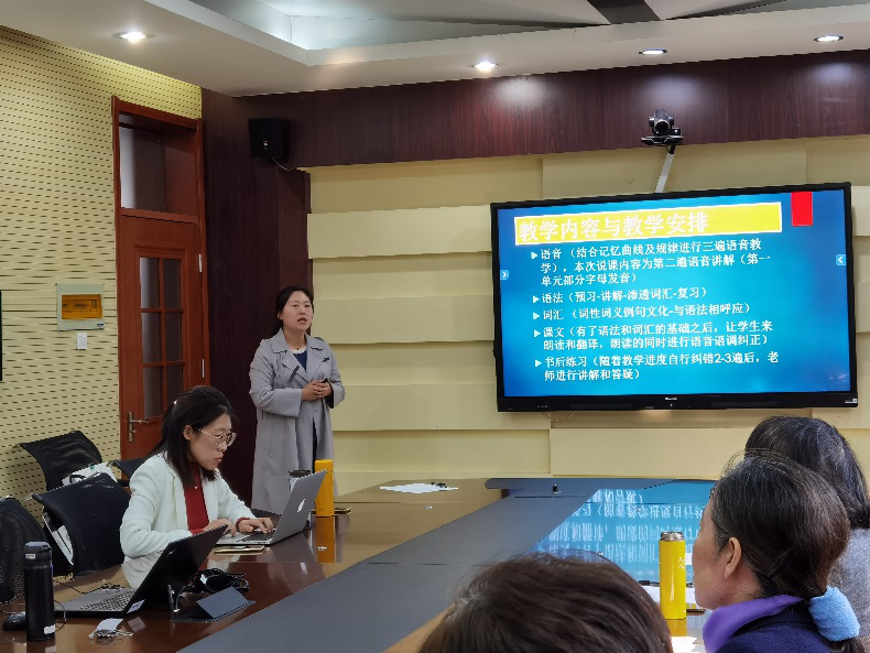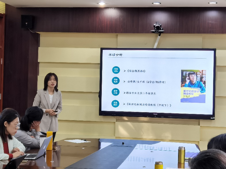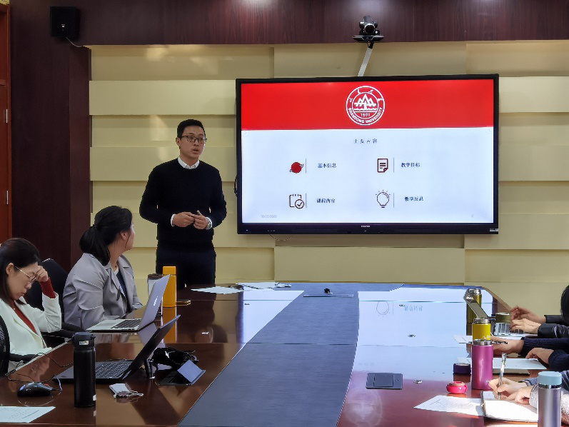 比赛采取说课的形式,时间为15分钟。各位参赛教师分别从课程的基本信息(课程性质、学分学时、学生对象、使用教材等)、教学目标、课程内容与教学安排(教学步骤、师生互动环节设计、课件形式和技术手段、预习任务与课后作业等)、以及教学反思四个方面展开教学。