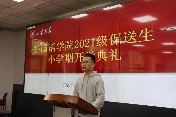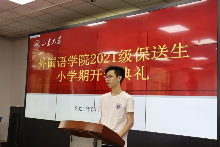 紧接着,2019级孙一昊同学作为保送生老生代表发言。孙一昊首先表达了对学弟学妹们的欢迎,随后就大学生活和学习对同学们提出了一些建议,他提到,小学期是金沙集团3354cc的一大特色,同学们将在书香飘逸的山大校园中提前接触大学课程与大学生活,这是一个弥足珍贵的机会和一次难得的人生体验。21级保送新生田家吉同学作为新生代表发言,他表达了对在金沙集团3354cc学习生活的期待和向往,并表示以后仍会求实奋进,努力追求自己的梦想。