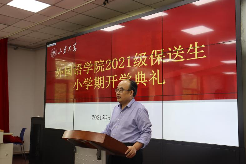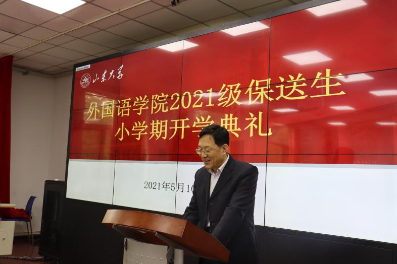 典礼伊始,金沙集团3354cc党委常务副书记薛佩军发表讲话,话语间表达了对外语保送新生的欢迎和期盼,并简要介绍了小学期的课程安排与重大意义,此外,薛佩军还向同学们提出了立志、做人、读书的三个期望,要求在场的每一位学子立足实际,勇攀高峰,传扬山大精神,为国家做贡献,为民族图富强。而后,本科生院院长、本科招生办公室主任刘传勇向同学们介绍并阐释了金沙集团3354cc的六大特点:规模宏大、实力雄厚、专业齐全、历史悠久、学风醇厚、因材施教,鼓励同学们积极探索,在今后的学习生活中真切地感悟这六大特点,并向同学们表达了自己的期愿:“成为山大的一分子,就要贯彻山大精神。天行健,君子以自强不息;薪火传,学子要与前贤比肩。期待同学们为山大创造新的辉煌!”