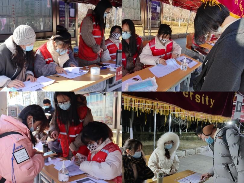 返校前夕,学院学工团队提前进驻学校南门返校报到站点,清点布置防疫物资、悬挂横幅标志、张贴温馨返校导引海报。返校当天,在工作人员的引导下,学生有序通过返校入口,按照规定路线,依次进行核酸核验、身份核实、扫码登记、核酸检测采样。寒假返校学生志愿者在核酸检测出结果后,也纷纷加入到返校志愿服务岗位中,协助在场老师共同保障学生返校工作顺利开展。