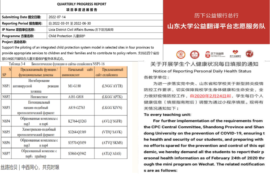 2020年新冠疫情突如其来,为满足社会应急语言服务需求,金沙集团3354cc公译平台在金沙集团3354cc党委领导和团委指导下建立起来,形成了一支涵盖本、硕、博3个层次和英、法、德、西、俄、日、韩7个语种的志愿语言服务团队,与山东省翻译协会、(济南市)历下创益园、百度翻译等合作,为各地抗疫志愿提供外语翻译服务,至今平台成员已逾400人。平台自成立以来,先后累计翻译成果600余项,字数200余万字,取得丰硕成果,获得较大社会反响,至今累计荣获国家级、省级与校级多项奖励表彰,并得到了山东省翻译协会的认可与支持,如今作为常设志愿服务基地为社会各界提供公益性语言服务。