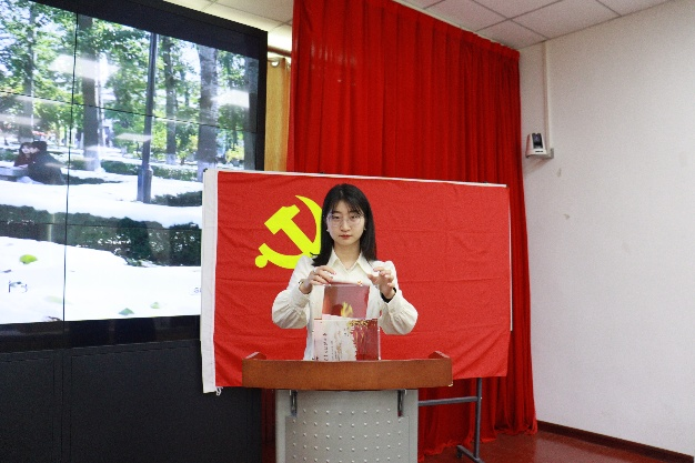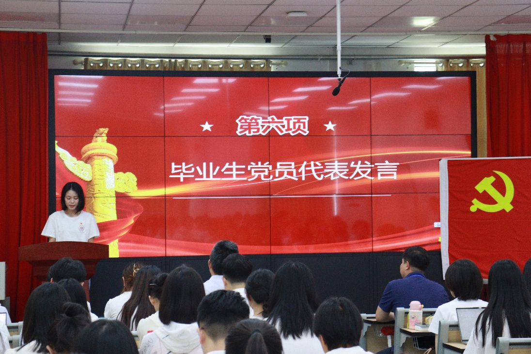 毕业生党员代表英语口译与翻译学硕士党支部林佳慧发言,她表达了对党组织及学院悉心培养的感激之情,并庄严承诺,要坚定理想信念、提升专业本领、担当时代使命,为全体毕业生党员树立了榜样。