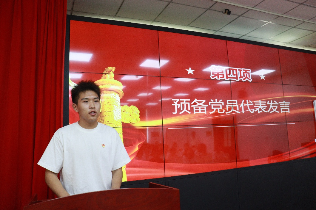 2022级本科生党支部刘澍阳代表预备党员发言。他细数自己入学以来向党组织靠拢的行决心与行动,保证始终坚定政治立场,勇敢奋斗,以身作则为人民为同学服务,展现学生党员的担当与作为。
