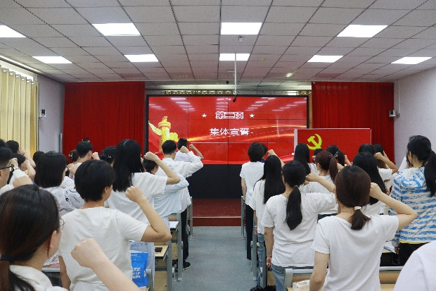 《国际歌》正式拉开活动序幕。在庄严肃穆的气氛中,全体党员整齐列队,面向鲜红的党旗郑重宣誓。在领誓人魏鲁鸿的带领下,一句句铿锵有力的誓言响彻全场,高喊着为共产主义事业奋斗终身的决心。宣誓后,预备党员佩戴党徽,金色的党徽在胸前闪耀,象征着党员们的信仰和责任。