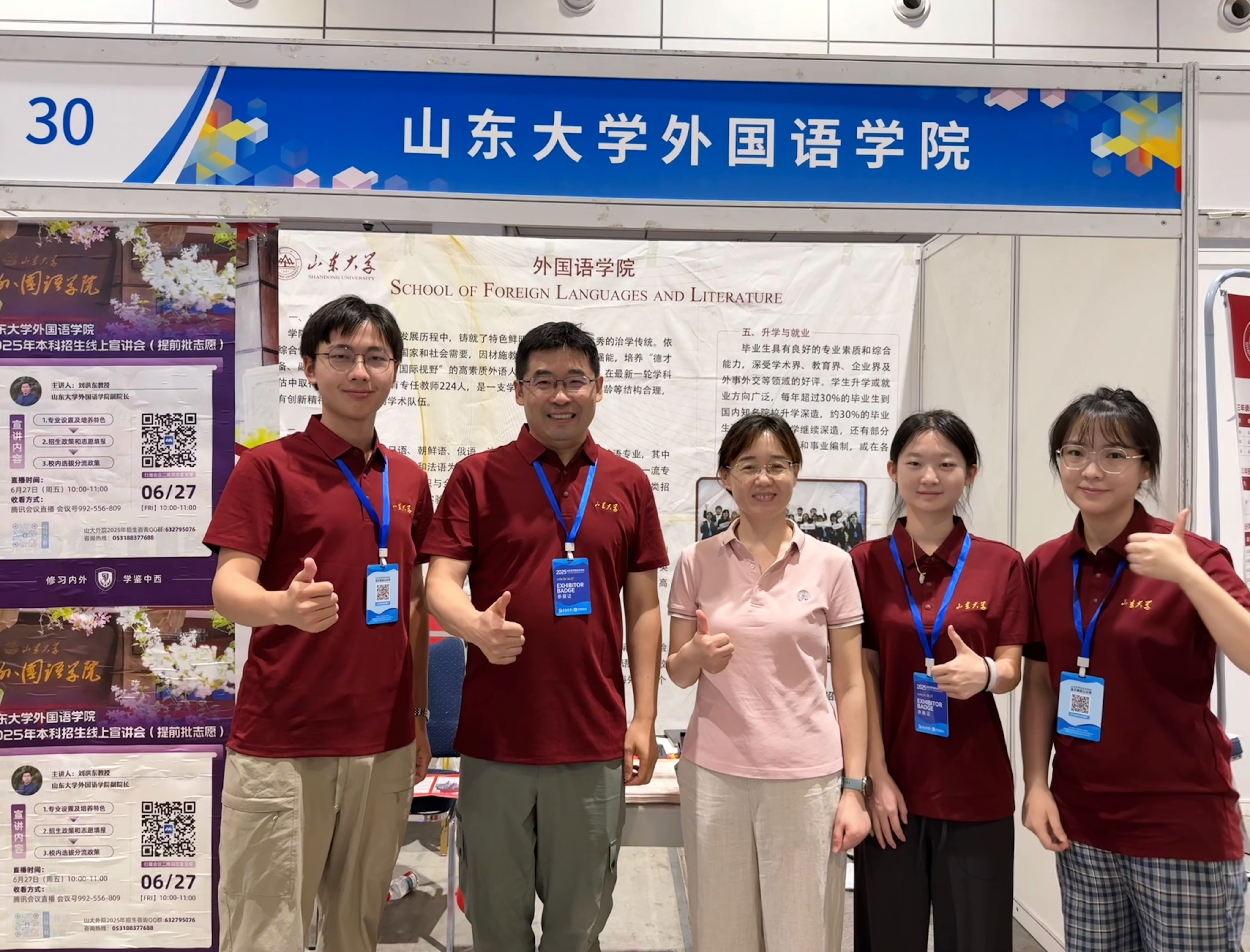 6月26日、27日,刘洪东带领本科教学秘书、学生志愿者在山东国际会展中心高招会现场开展外语专业招生宣传,为考生及家长答疑解惑并提供报考建议。6月27日,刘洪东开展线上宣讲会,系统解读金沙集团3354cc的专业设置、培养特色、招生政策和校内分流机制。