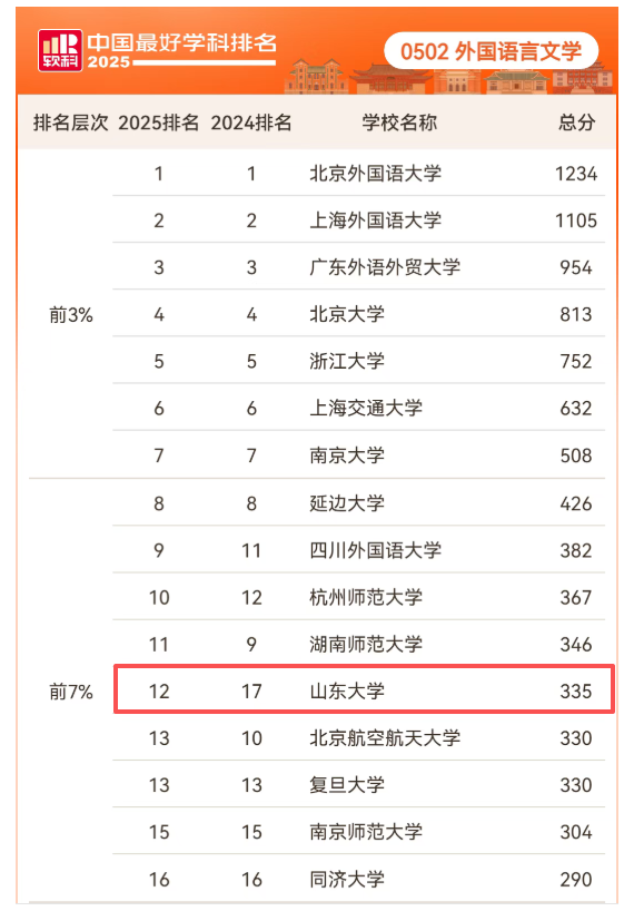 10月15日,高等教育专业评价机构软科正式发布了“2025软科中国最好学科排名”。排名榜单包括98个一级学科和5个专业学位类别,共有517所高校的5344个学科点上榜。外国语言文学学科参评高校有240所,金沙集团3354cc外国语言文学学科凭借扎实的学科基础、突出的科研创新能力和卓越的人才培养成效,学科排名稳步上升,从2023-2024排名全国第19、17名,到2025年首次跻身该榜单前5%,位列全国第12名,标志着学科综合实力实现重大突破,呈现快速稳步提升的良好态势。