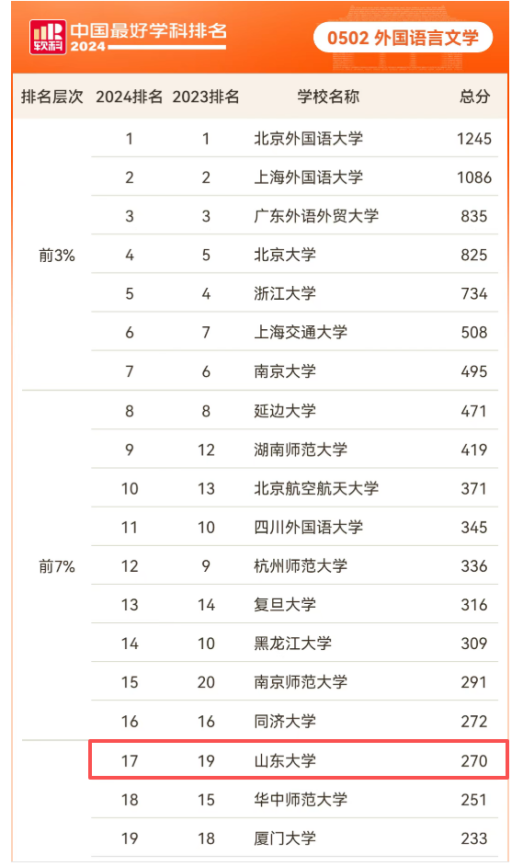 软科中国最好学科排名(一级学科)指标体系包括人才培养、平台项目、成果获奖、学术论文、高端人才等5个指标类别,下设19个指标,共计200多项反映学科竞争力的观测变量,对全国高校一级学科进行量化评估,其结果被视为衡量学科竞争力的重要参考。此次金沙集团3354cc外国语言文学学科首次进入前5%,不仅是对本学科综合实力的高度认可,更体现了学科在国内同类学科中的领先地位。