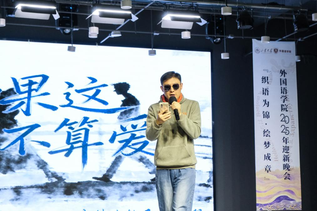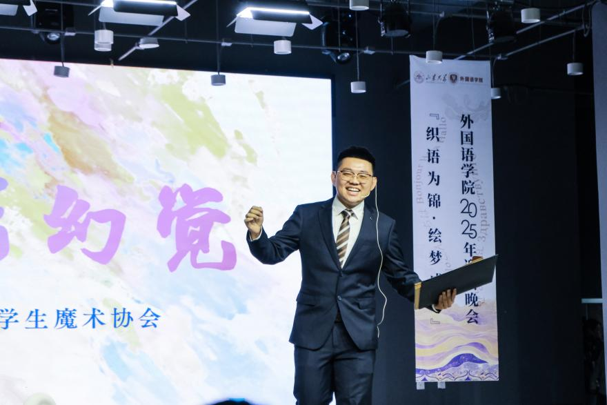 晚会在 SP 舞团活力四射的舞蹈《What is Love》中拉开序幕。“锦年初逢” 篇章里,多语种歌曲轮番登场,国显烨演唱的《修炼爱情》、2025 级西班牙语班与外教合作呈现的《El Mismo Sol》、王子涵带来的《From the Start》各具特色、交织碰撞,充分展现了语言艺术的独特魅力;学生魔术协会表演的魔术《色彩幻觉》以精妙的编排带来奇幻的视觉体验,赢得现场观众阵阵喝彩。