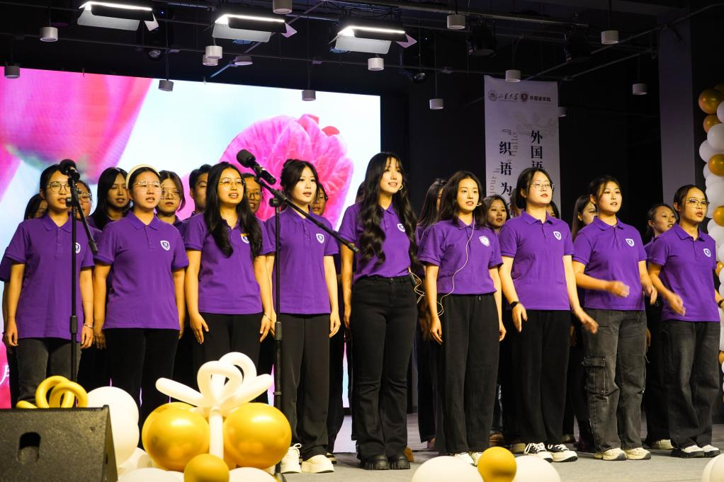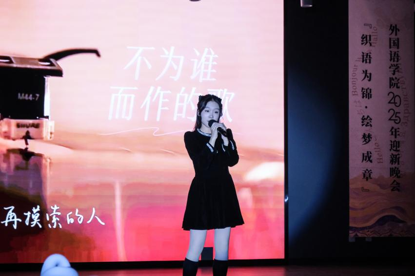 “语丝成彩” 篇章中,Dream-Seeker 器乐社演绎的《Cocoon》、N.Jeans 组合表演的舞蹈《How Sweet》洋溢青春气息;杨鲁仪演唱的《不为谁而作的歌》深情动人,2025 级法语班的朗诵《从心之所向到国之担当》铿锵有力,抒发了青年学子将个人理想融入国家发展的壮志豪情,引发全场共鸣。
