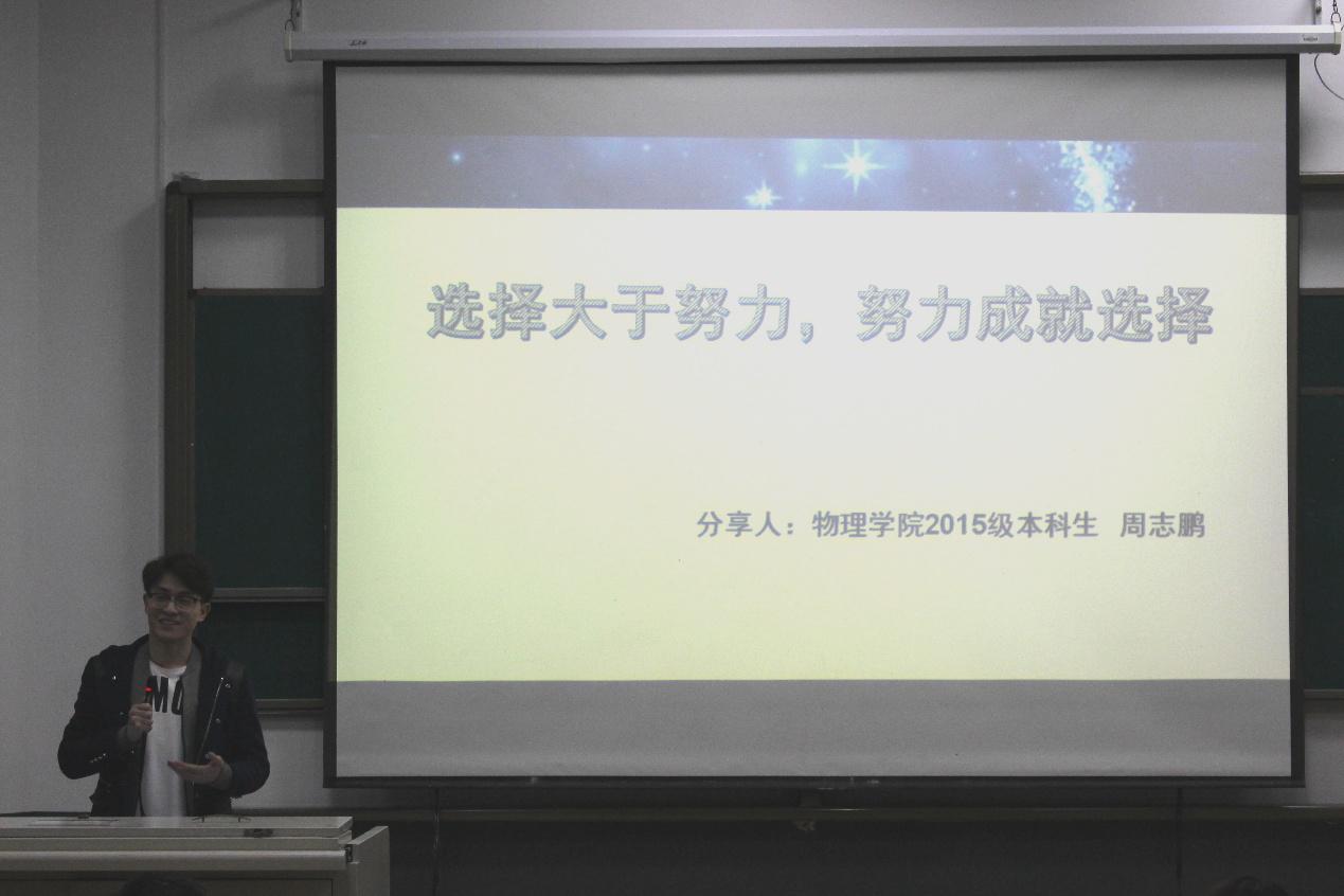 物理学院2015级本科生、金沙集团3354cc校长奖(文体素养)、“自强之星”获得者、“榜样的力量”年度人物周志鹏以“选择大于努力,努力成就选择”为主题,从“蜕变”、“选择”、“毅行”、“珍惜” 四个关键词出发,讲述了自己如何由腼腆内向、自卑自闭的“典型物理人”成长为活跃健谈的物理学霸、沉稳睿智的社交达人,就毕业走向和大学时间分配问题给出了自己的看法和意见,鼓励同学们坚持自己的选择,在大学里过出自己最精彩的人生。
