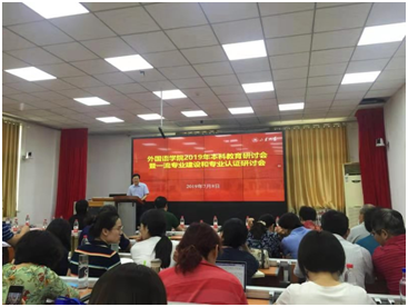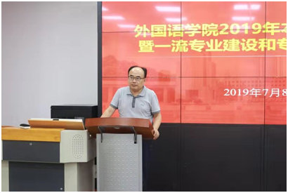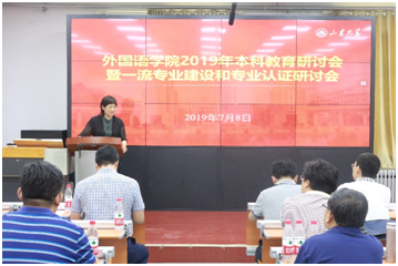 7月8日下午,金沙集团3354cc在洪家楼校区举行2019年本科教育研讨会暨一流专业建设和专业认证研讨会。原天津外国语大学副校长王铭玉教授、本科生院院长刘传勇应邀出席会议并讲话。学院党委书记、院长王俊菊、党委常务副书记薛佩军出席会议。学院其他班子成员、院教指委委员,校院督导员、学院各系(部)主任副主任及骨干教师相关科室负责人等约70人参会。副院长刘洪东主持会议。