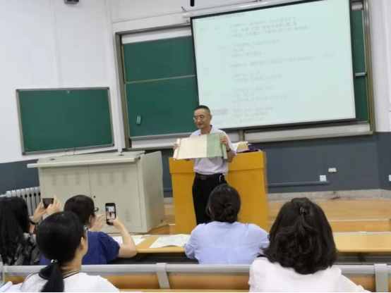 本课程采取集中授课形式,来自不同校区、不同专业的学生汇集一堂,在为期四天的课程讲解中,吉村教授首先从宏观角度对日本文学的总体发展及脉络做了大致的介绍,在阐述《古事记》《日本书纪》的内容与特色基础上,以今年刚刚更换的年号“令和”为契机引导学生进入《万叶集》的世界。《万叶集》作为日本最早的一部和歌集,收录了4-8世纪中叶的和歌,共4500余首,20卷。歌人地位不同,和歌形式多样,内容异彩纷呈。吉村教授主要选取万叶和歌中的季节歌、恋爱歌、羁旅歌、社会歌,结合当时的社会、历史、民俗等内容深入分析,具体阐述了和歌的内涵以及与中国文学的关系。吉村教授长期致力于《万叶集》和歌的研究,视角新颖,成果甚丰。其讲解内容详实、旁征博引、幽默风趣,不仅为大家带来了日本古都奈良的地图,还向大家展示了现存最早的《万叶集》手抄本以及影印本。此外,吉村教授的授课借助图片、音乐等形式,穿插历史、地理、民俗等知识,在畅谈文学之余,展示日本文化的雏形与特色,以及与中国文化的渊源关系。本课程的开设进一步加深了同学们对日本及日本文化、文学的了解。