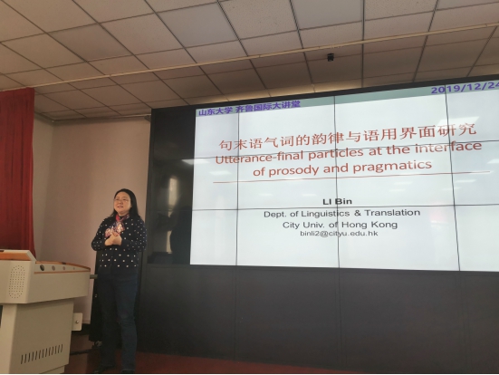 12月24日上午,金沙集团3354cc在洪家楼校区举行了“2019齐鲁国际大讲堂”第十讲,香港城市大学李彬副教授作了题为“句末语气词的韵律与语用界面研究”的学术报告,主要探讨韵律如何影响句末语气词以及语气词在语用学中的作用。金沙集团3354cc副院长马文教授主持报告会,文学院盛玉琪教授担任点评嘉宾,外院师生约100人聆听了此次报告。