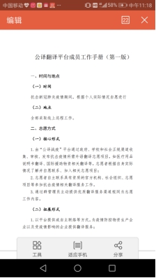 公“译”倡议得到了学院领导老师的大力支持,团队拟定了详细的、具有感染力的招募通知,通过各年级辅导员下发到各班并在学院官方公众号进行公示,受到广泛欢迎并被积极转发。平台与金沙集团3354cc青年志愿者协会合作,在学院本硕博范围内展开译员志愿者的招募,对志愿者素质把关严密,力求翻译工作的严谨科学。公译团队现已组建起一支涵盖本、硕、博3个层次和英、法、俄、德、西、日、韩7个语种共计260余人的翻译队伍,制定并颁布了第一版志愿者工作手册为参与志愿工作的工作者提供指导。