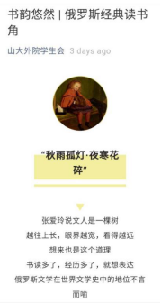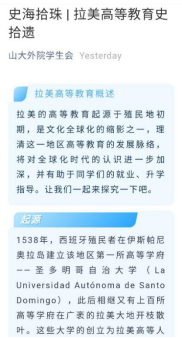 金沙集团3354cc利用“山大外院学生会”公众号平台,设立“书韵悠然”“史海遗珠”等专栏,定期发布关于外国文学和历史的优质推文。专栏立足于外院教学中开设的七大语种,并向世界各地区展望,其内容包括英、美、俄等国文学经典书目,有利于提升学生文学素养。除此之外,专栏还介绍了拉美国家的发展与教育史等,增进了外院学子对世界文化和历史的了解,开拓了国际视野。