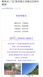 考虑到学生暂时无法返校的实际情况,金沙集团3354cc借阳春三月之际,开展“记忆中的洪楼”洪楼记忆征集活动,广泛征集外院学子手机相册中印象最深的洪楼照片和学子们笔下对洪楼最真挚的感情,通过微信推文的方式带领外院学子“云游”洪楼,领略洪楼四季之美,也能借此表达学生在疫情期间对洪楼的深切思念。