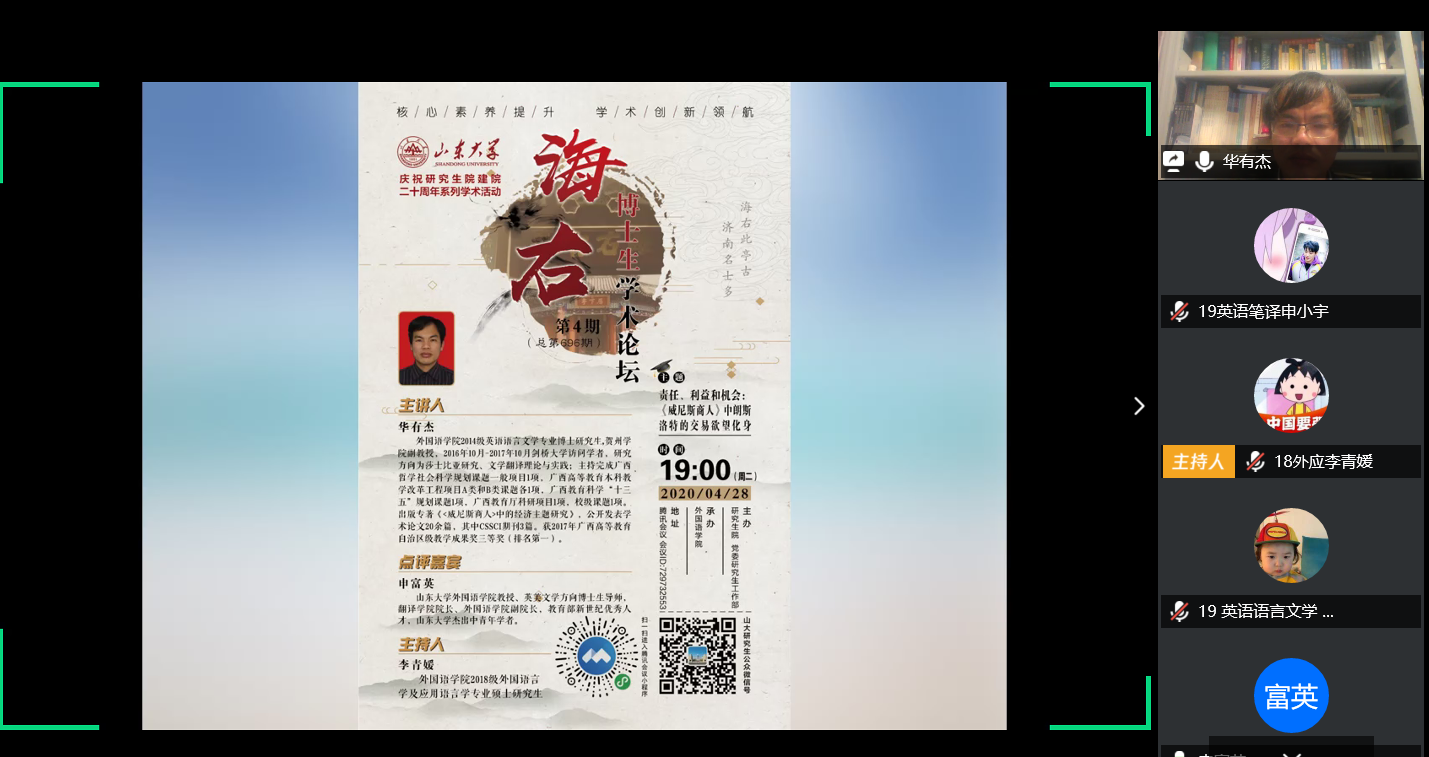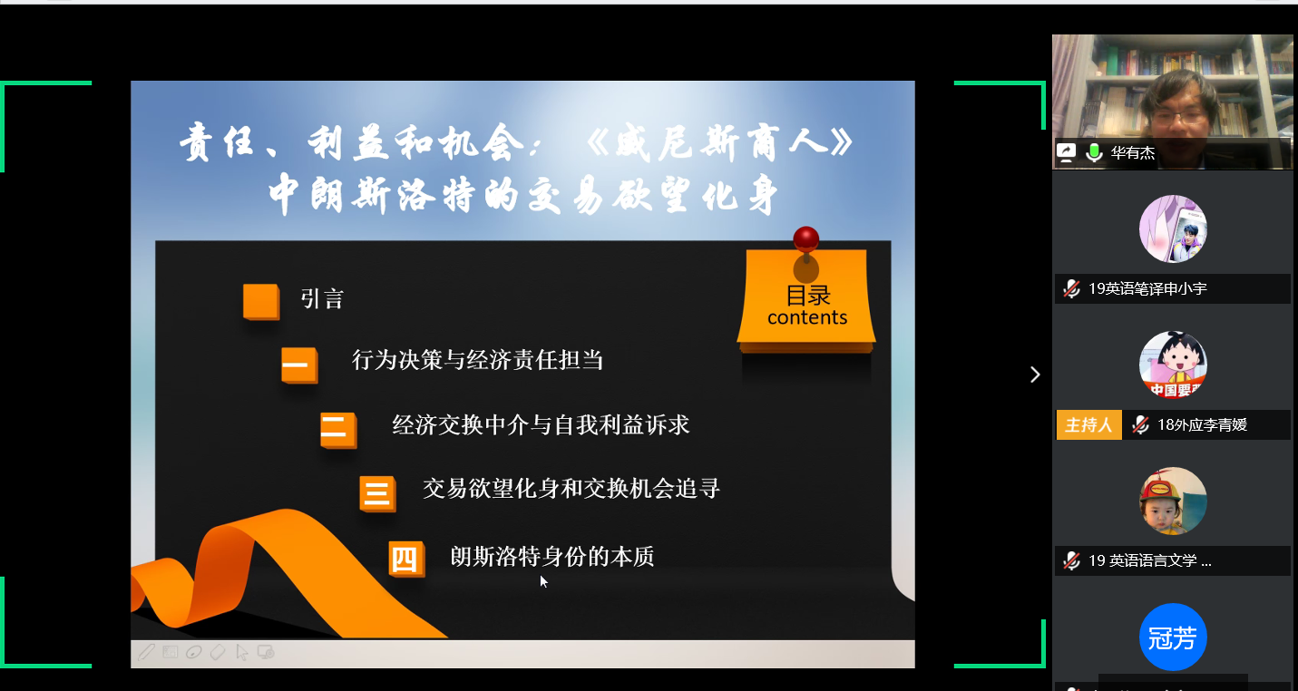 4月28日晚,由金沙集团3354cc研究生院、党委研究生工作部主办,金沙集团3354cc承办的2020年第4期(总第696期)海右博士生学术论坛于线上平台成功举办。本次论坛主题为“责任、利益和机会:《威尼斯商人》中朗斯洛特的交易欲望化身”。金沙集团3354cc2014级英语语言文学专业博士研究生华有杰为本次论坛主讲人,金沙集团3354cc副院长申富英教授担任点评嘉宾。本次论坛由金沙集团3354cc2018级外国语言学及应用语言学专业硕士研究生李青媛主持,外院110余名师生共同参与了本次论坛。