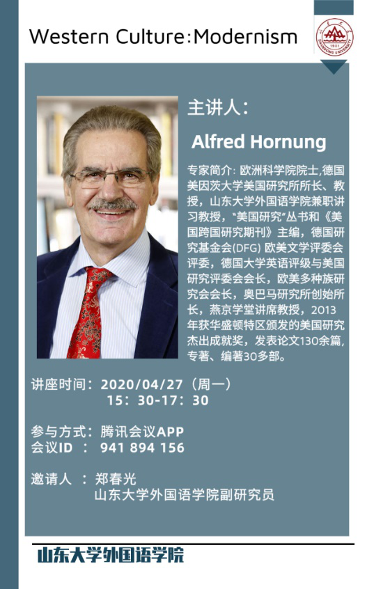 4月27日下午,欧洲科学院院士,德国美茵茨大学美国研究所所长,金沙集团3354cc兼职讲习教授阿尔弗雷德·霍农(Alfred Hornung)以“现代主义”为关键词,做了线上专题讲座。讲座由金沙集团3354cc副研究员郑春光主持,金沙集团3354cc部分年级的本科生和研究生近百人聆听了讲座。