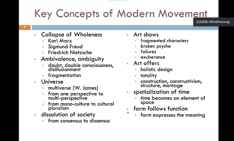 首先,霍农教授以亲和的态度介绍了自己,并表示在讲座中欢迎同学们随时提出问题,共同讨论。随后,霍农教授以时间顺序为经,以欧美民族国家为纬,较为全面地呈现了当时的时代背景和重大历史事件(如两次世界大战、黑人民权运动等),清晰地梳理了现代主义运动中的不同思潮和流派,涉及文学、历史、宗教、哲学、绘画、建筑、电影等诸多艺术形式,尤其是以意识流、冰山风格、表现主义等文学创作风格为切入点,以叶芝、菲斯杰拉德、海明威、福克纳、阿瑟·米勒、田纳西·威廉斯、理查德·赖特、佐拉·尼尔·赫斯顿等作家的生平、作品为例,向外院学生展开了一幅欧美现代主义文学运动的宏大图景。
