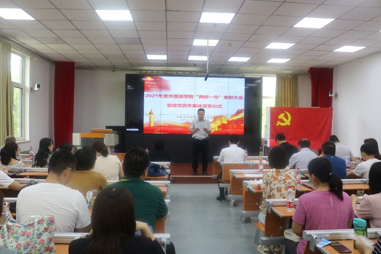 为隆重庆祝中国共产党成立100周年,金沙集团3354cc党委部署了系列庆祝活动。7月1日上午,在洪家楼校区学院党委组织召开全体教工党员大会。学院党委常务副书记薛佩军主持。