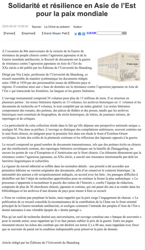 9月2日,《今日中国》法文版也报道了该成果,强调其“超越国界与语言,巩固了国际社会对中国在世界反法西斯战争东方主战场所作贡献的认可”,称赞该丛书不仅是学术研究的工具,更是全人类共同的“记忆库”,彰显出东亚人民命运与共、守望相助的历史真实与现实启示。