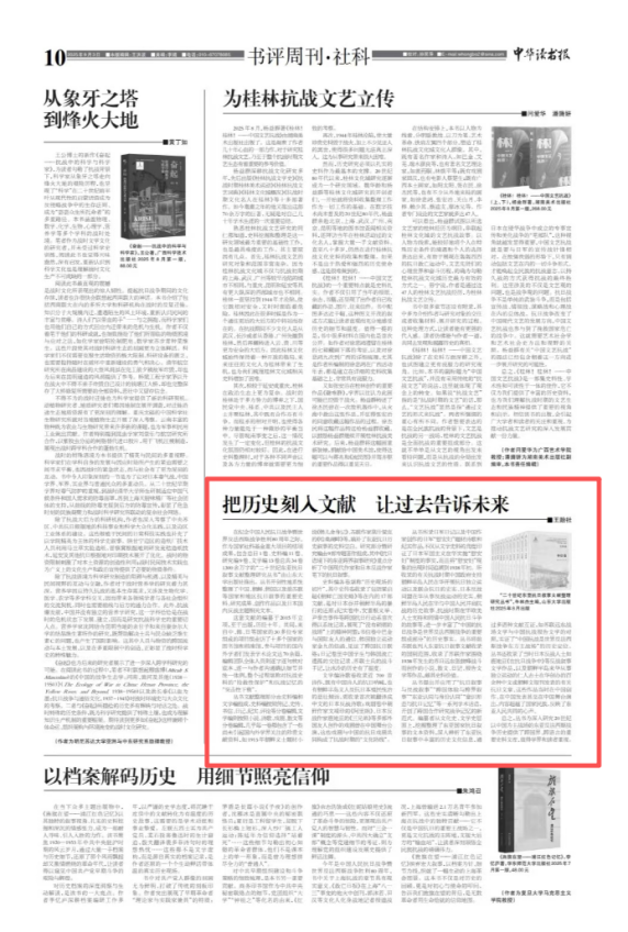 9月3日,《中华读书报》第10版“书评周刊·社科”刊登了题为“把历史刻入文献,让过去告诉未来”的书评文章。文章指出:“丛书提出并应用了‘抗日叙事与反战叙事’‘跨国体验与跨界叙事’‘东亚认同与身份认同’等一系列创新性学术话语,开创了跨国合作研究战争记忆的新范式。编纂者从文化史、文学史层面上,挖掘整理了东亚国家抗日叙事的文本资料,深入辨析了东亚抗日叙事中丰富的历史文化信息,通过多语种文献互证,实证了‘中国抗战是世界反法西斯战争东方主战场’的历史定位。”
