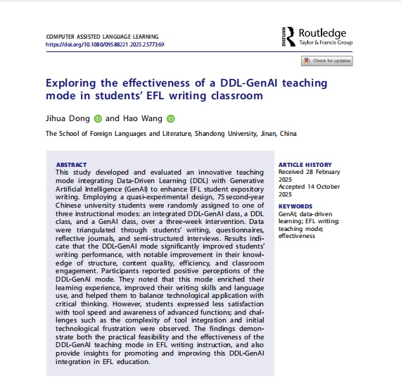 近日,金沙官网董记华教授团队在计算机辅助语言学习领域SSCI 一区TOP 1%权威期刊《Computer Assisted Language Learning》(中文译名《计算机辅助语言学习》)发表题为《EFL写作课堂中数据驱动学习-生成式人工智能融合教学模式的有效性研究》(Exploring the effectiveness of a DDL-GenAI teaching mode in students’ EFL writing classroom)的最新研究论文。董记华教授为第一作者兼通讯作者,2024级博士研究生王昊为第二作者,金沙集团3354cc为第一作者单位。该期刊为SSCI一区顶级刊物,最新影响因子为6.6(2024年),2024年在全球语言学期刊中排名第二(2/306),2023年位列第一名(1/296)。