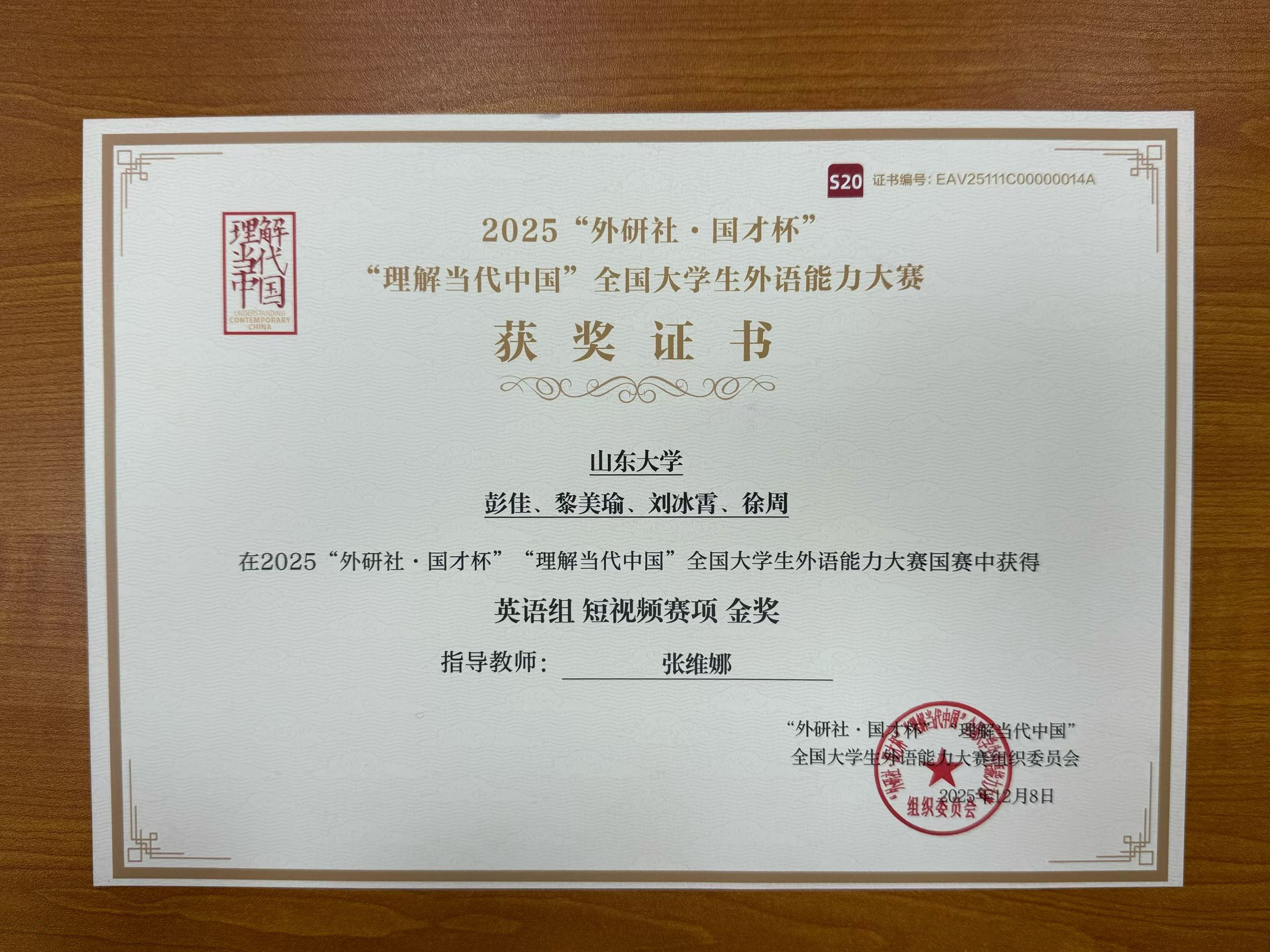 金沙集团3354cc彭佳、黎美瑜、刘冰霄、徐周在2025“外研社·国才杯”“理解当代中国”全国大学生外语能力大赛国赛中获得英语组短视频赛项金奖。